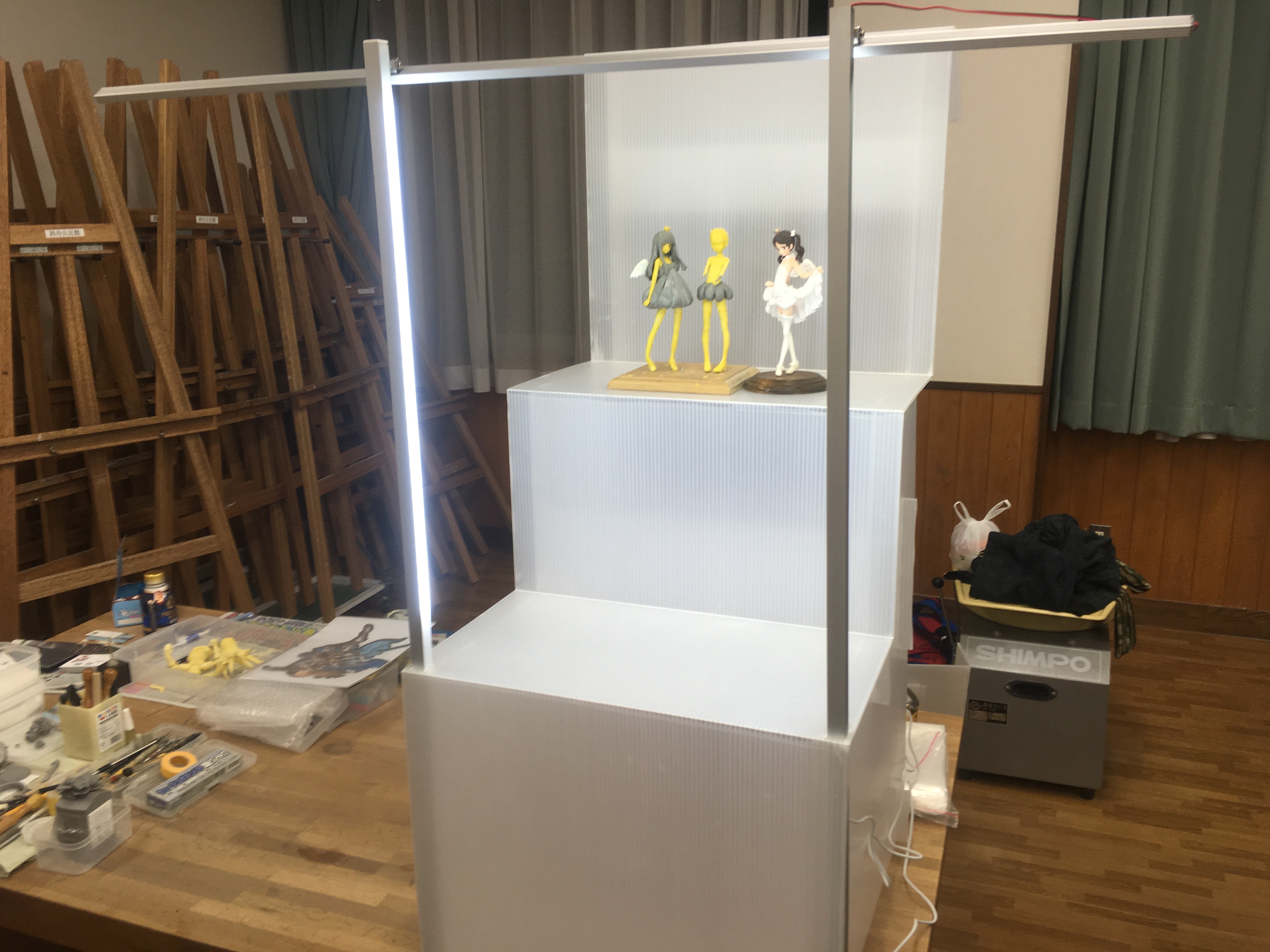 (可変式アルミフレームが長いのは、展示の際に展示台を2セット並べて使うためです)